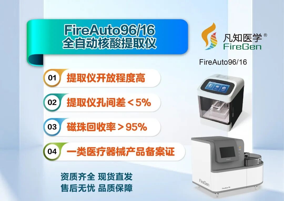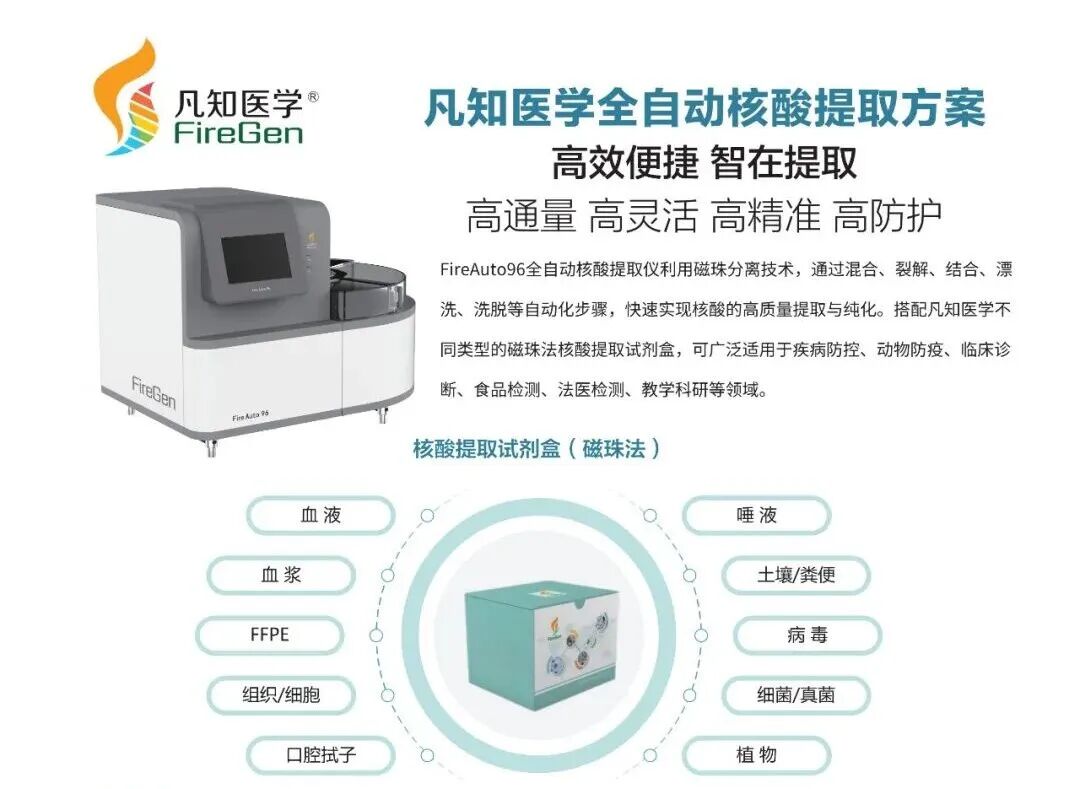 凡知医学——FireAuto系列全自动核酸提取仪,基于磁珠分离技术,一次可连续处理1–96例样本,配套不同种类试剂盒,最快15min即可从全血、病毒、组织、植物、细菌、培养细胞等样本中一键完成高质量的核酸纯化。利用高通量模块+即用型磁珠试剂,把人工误差、操作时间和成本压缩到最低,是各类分子实验室的“核酸提取利器”。